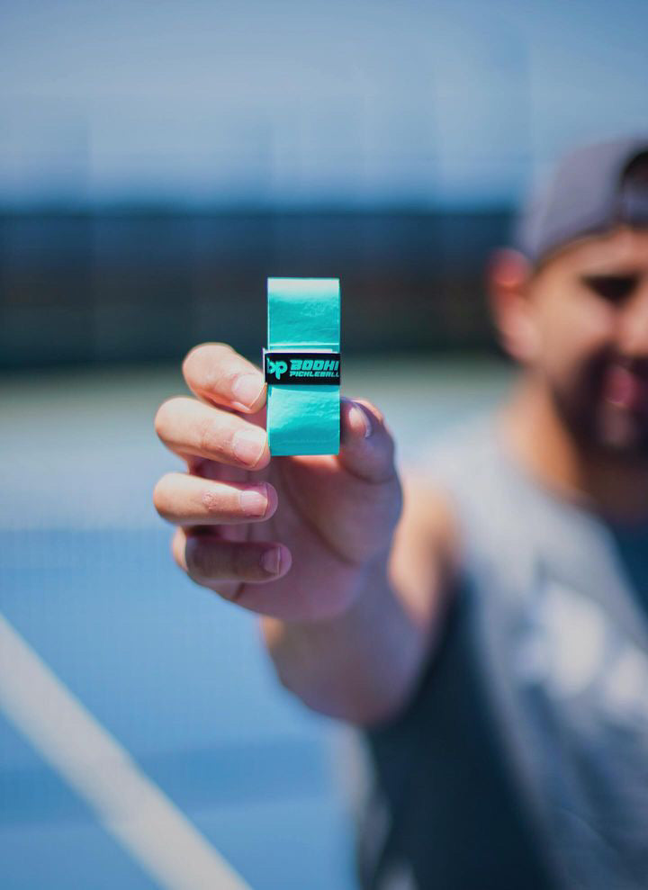 Hold your paddle upside down. Apply the adhesive side of the overgrip to the edge of your end cap, on top of your stock grip. Begin wrapping your handle. Overlap the overgrip to your preferred thickness. If you are a lefty, wrap to the left. If you are a righty, wrap to your right.